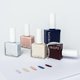 建议搭配蕴含维他命E的表底双效护甲油做打底,保护、强化指甲。使用同支产品做上层油,同时护色、增添持久亮泽。或者刷上哑光表层油,即刻呈现丝绒般细腻雾面质感,营造兼具雅致与前卫的个性酷感。