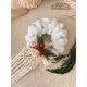 这款 云朵圣诞花圈 使用蓬松的云朵羊毛条手工缠织而成,搭配编织花边结的垂坠设计、松果与冬季绿叶点缀,像是一个安静降落在家里的冬日礼物。