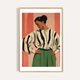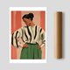 《绿裙与凝视 Woman in Green》以精准俐落的笔触与饱和色彩描绘出女性形象。人物眼神低垂,服装设计富含几何节奏与对比色彩,整体构图具备强烈风格感。画面既时尚又富诗意,是对当代女性美学的一种凝视与致敬。