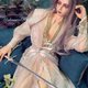 ワーグナーのパルジファルからのインスピレーションです。 宗教、ナイト、伝说、三つの要素でデザインしました作品です。光沢あるシフォンは神秘的かつ清らかな伝说のイメージで、高贵なゴールドやパールなどでナイトの高い地位を表します。全体の色彩は宗教テーマに相応しく、ゴールドと白だけでまとめています。使い胜手のよいゴールドチュールとセットで、ベールでもパニエでも使えます。ガウンもリボンを外せば、またゆったりした羽织ものになり、ほかの服と合わせてアレンジできます。