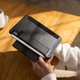 **站立式 iPad mini 皮革保护套,保护机身同时赋予其温暖手感。支持自动休眠/唤醒功能,并可固定 Apple Pencil,方便随身携带。**