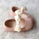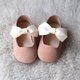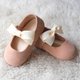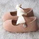 - 粉肤色反毛皮及米白色缎带蝴蝶结女宝宝学步鞋、周岁礼物。