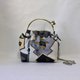 这款肩背包使用了描绘着旧时玩具的浅灰色织带制作而成。