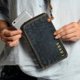 吊绳蓝色丹宁布水洗后复古套色(金黄色车线)、真牛皮、复古铜扣