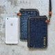 外层蓝色丹宁布水洗后手工刷白加上复古套色、咖啡色内衬、金黄色车缝线