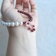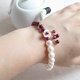 此款手串采用强光近园微瑕的珍珠,微有冰裂,无杂质,通透的紫牙乌石榴石为主材的手串。天然淡水珍珠,珍珠光泽度高,光泽为冷光偶有彩光,圆度为近园或扁圆,土豆园,非正圆,微瑕,社交距离下基本看不出。凑近细看可见。瑕疵包括有花皮,微纹,小点,极个别微有凹凸。皆是纯天然材质,搭配深海粉蝶贝花托,包金链等配件,让花朵在腕间绽放,摇曳多姿。精致甜美,优雅脱俗,高贵大方。