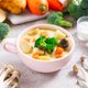 严选柔嫩鲜美姬菇搭配口感肥厚的杏鲍菇并配上花椰菜、马铃薯、红萝卜、豌豆多种蔬菜,用香茅、南姜、绿辣椒等泰式特有香料佐椰奶熬煮成酱,辛辣椰香的风味,淋在饭上一口接一口。