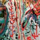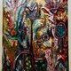 调色板以鲜艳的红色、青绿色、深邃的绿色、金黄色和深色调点缀。这些色彩唤起了生长、神秘与活力,而层叠的构图则在作品中创造出动态感与节奏。整体氛围是神秘、充满活力且带点难以捉摸的。