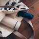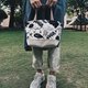 低部拼接有点粗糙质地的棉麻布料,内层以棉布制作,并有隔层可放置手机、餐具或是其他物品。