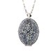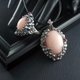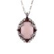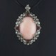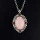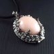 主石为重达31.9ct 的天使粉红蛋白石,饱满蛋面切磨,搭配深红色蛋面石榴石作为莓果元素,点缀于藤蔓草叶的纯银浮雕装饰。背盖装饰主题对应的藤叶剪影和纹理质感,内框 30 x 22 mm 范围可放置相片做为相盒,或放沾取少量香水的棉片,作为香囊配戴。内框背底以 24K 金箔装饰藤叶剪影,整体以硫化染复古处理。