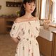 - 一条可两种穿法的连衣裙:弹力插肩袖、领口是松紧可伸缩的,可以滑下来做露肩装,也可以常规穿着。