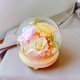 “春日微光”以柔和的黄色、粉色与白色永生花为主,搭配细腻的衬花与绿叶,营造出如晨曦般温暖的氛围。玻璃盅宛如一个小小的世界,将春天的光影与花语轻轻封存,为空间带来宁静与希望。