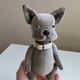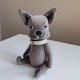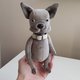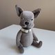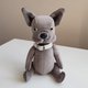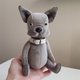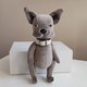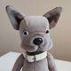 A cute toy bulldog is made of velour, stuffed with holofiber. The head and paws are movable, jointed with cotter pins. Size: standing height 8 inches (20,5 centimetres), in the sitting position 6,5 inches (16,5 centimetres). Care: dry cleaning.