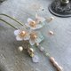 花朵为浅粉色天然粉水晶绑成,叶子为东陵玉雕刻,使用天然淡水珍珠做花心,天然石颜色深浅纹路每片都不尽相同,也可能会有杂质,除珍珠的枝梗外其余枝梗皆为钢线做成,可以再线长范围内调整姿态,但请勿握着花瓣调整,其它金属皆为铜质,此款有长短两条活动式垂坠,以上能接受再购买喔!