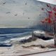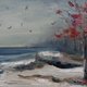 深秋海沿岸风景,暗海水,雪,红树油画