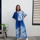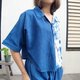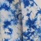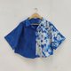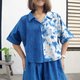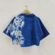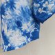 靛蓝色衬衫领短袖短版上衣。扎染半部蓝色和云状图案。
