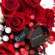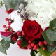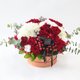 花材:进口厄瓜多尔尔红玫瑰、白色绣球花、红火龙果 、大银果、尤加莉叶、棉花、缎带。