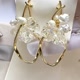 耳环展现了精致的工艺,整体设计融合了金色金属和透明感、珍珠元素,散发出优雅的氛围。耳环的形状为不规则的几何图案,搭配飘逸的花朵装饰,增添了艺术感与女性魅力。