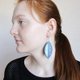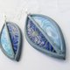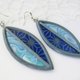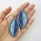 Handmade lightweight blue earrings in the form of drops. Oval drop earrings with geometric pattern in art deco style and abstract stains.