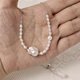 “初见”项链以一颗不规则的巴洛克珍珠为焦点,其独特的形态仿佛初生的蓓蕾,含苞待放,项链两侧点缀着细巧的淡水珍珠,错落有致,如同不经意间散落的露珠,清新而雅致。简约的设计,展现佩戴者率性而优雅的个人风格,留下令人难忘的印象。