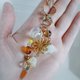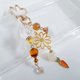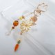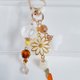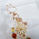 以沉稳的棕色与黄水晶色调的捷克珠饰,点缀着引人注目的梦幻彩虹马赛克珠,以及摇曳的白色花朵流苏。搭配黄水晶色的月光石、小巧的红萝卜吊饰,与黄色铃兰珠等,悬挂于大朵镂空花朵吊饰上,再与可爱的兔子造型挂钩巧妙结合,打造出这款别致吸睛的钥匙圈。
