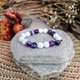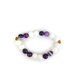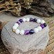玉华紫韵手链以洁白如脂的白汉玉为基调,象征高雅与纯净;紫条纹玛瑙的深紫与淡紫相间,如同流动的丝绸般细腻,带来温暖又神秘的层次感。金色锌金属的圆形配件如太阳的光环,点缀其间,为整体增添一抹贵气与复古气息。
