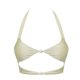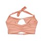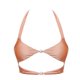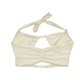 上衣挂脖设计可以使肩膀显瘦,中间镂空设计可以让胸部形状更丰满及腰部比例更幼。下身采用高腰设计,会使腰部视觉更显幼细,镂空部位同V cut也会使腿部视觉效果修长,而背面褶皱则可以使臀部更饱满。