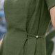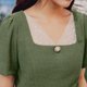 - 即是方领也是V领,前领口在用珍珠扣做装饰,点睛之处,收腰的款式再加上腰带,无疑收腰中的战斗机,为了达到更好的视觉效果,两根腰带交叉处钉了一个小小的珍珠扣,和前领中的扣子相呼应,达到最好看的效果。