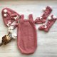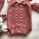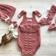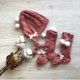 Hand made berry color knit clothing set for baby girl, or boy. Romper, hat and socks with mink fur. Can be as take home outfit, baby shower gift, birthday set, baby”s pictures gown. Can be in berry, red, pink, blue and white colors.