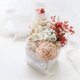 法国白梅、白色金杖球、粉色不凋索拉花(此款花可加入些许香水,可以当香氛花使用唷!)、白色绣球、粉色绣球、白色金杖球、红色不凋小满天星、红色虎眼