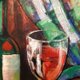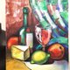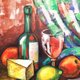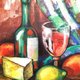 标题“酒瓶、一杯酒、起司和水果”。