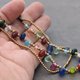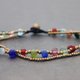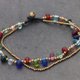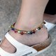 这是一款手工编织的脚镯,由深棕色棉蜡线与多色玻璃珠和黄铜珠编织而成。用铜钟封闭