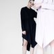 长袖衬衫式洋装,前后长、两侧短,袖口有小尾巴。前后小V领口呈现困难度极高 “折纸剪裁” 的优雅,后领口V字带有日本传统服饰美感。