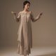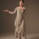 不对称肩带。 一字领抽皱绑带松紧自如。 抽皱袖细节。 光泽钮扣点缀。 中高腰线搭配双层裙片。 身后绑带系放自如。 不规则下摆与侧开衩随兴洒脱。