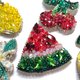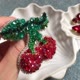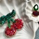 - A brooch with a cherry motif made with plenty of glass beads. Cute cherries with rolling, round fruits snuggling up to each other. It has a strong presence, so it can be worn not only on clothes, but also on a bag.