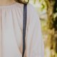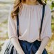 这次选用了十分可爱纹路的粉裸色布料制作上衣,微微的皱折增加了伞形设计,手袖做了阔松的橡皮筋,适合大部分的女生喔!
