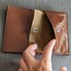 这个银包的表面刻着巴黎凯旋门,啡色仿皮制造,小巧之余又实用。打开共有两个卡位和一个零钱格,后面还可以放纸币,很适合用来当旅行银包。皮质有点历史痕迹,但整体状态良好。