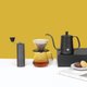 冲出完美咖啡,就由这套精美套组开始。先使用C3手动磨豆机准备咖啡粉,再用Fish Pure热水壶和温度计找出理想水温。将玻璃滴头放在容杯顶部,然后利用拥有专利的细嘴壶将热水精确地注入。
