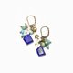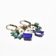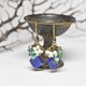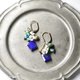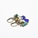 Earrings made of lapis and turquoise, florets of white pearl oysters, labradorite, and small bells.