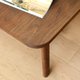 这种桌子的高度很容易撞到小腿,因此桌面的边角设计采大型的圆弧状,这也是客厅桌才有的贴心设计。令人讶异的是这种很容易让人觉得孩子气的形状,在旭川家具讲究的设计之下,反而能保有成熟的大人风格。而顶板的侧面采用垂直切割的设计,由于这种切割方式能让侧边维持最小面积,因此能使作品呈现出凛然的时尚氛围。这种小小的巧思除了能防止顶板的边角破损,同时也提高了安全性。