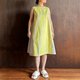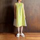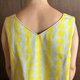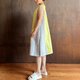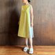 这款结合式洋装采用 A 字版型,长度及膝以下(模特儿身高 157 厘米)。领口设计为前身船型领,后身为深 V 领。此为套头式无袖洋装。前身胸口处有左右各一的公主线。