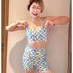 这款俏皮的瑜伽套装以蓝色和白色波浪条纹为特色,唤起柔软的云朵和海风。印刷品上散布着五颜六色的卡通风格花朵和欢快色调的笑脸,每一个都像贴纸一样勾勒出有趣的3D效果。一道小小的彩虹增添了梦幻般的色彩。这个设计轻松愉快,给每一个动作都带来了良好的能量。
