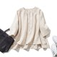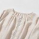 前襟整齐排列的白色钮扣增添细腻女性气质,搭配蓬松袖型设计营造优雅氛围,无透肤特性的厚实亚麻面料让穿着更显从容自在。