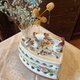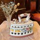 这款来自英国的瓷器,造型独特,是一个熨斗造型的装饰品,熨斗的把手、底座和熨烫面都完整呈现,造型生动有趣。瓷器表面有精致的手绘花卉图案,包括玫瑰、蓝色小花和绿叶,色彩鲜艳,笔触细腻。熨斗的边缘和把手也有精细的彩绘装饰,增添了瓷器的艺术感。瓷器的整体风格带有浓厚的复古情怀,属于1950至1970年代的装饰艺术风格。这种风格的瓷器通常带有独特的手工感和怀旧的色彩。