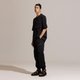 以军装长裤为设计主轴,穿起来十分轻盈无负担;俐落的直筒廓形,搭配两侧工装口袋,使整体在活动时,更加立体有层次;裤脚打褶设计,增加视觉上的份量感,能够拉长并修饰线条比例。