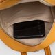 包包設計成可側背、可單肩、可後背。材質選用的是植鞣牛皮,本款黃色為手工染色,配上YKK金屬拉鍊以及純棉內裡。