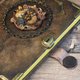 The lower caboshon is grey labrador, the gear-looking 3 little things on leather are real fossil water lily fragments colored with acrylics.