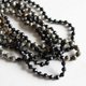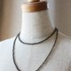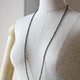 由黑尖晶石和黄铁矿制成的长项链,用黑色丝线一一绑起来(都是结)。由于石上的孔位置略有不同,有些部分不稳定,但我们希望您能享受作为手工艺的乐趣。调节器、球头、龙虾环和环圈均由黄铜制成。