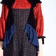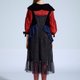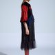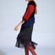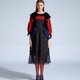 *黑色天鹅绒与立体点点织线面料拼接,加上蓝色绣花网布腰间点缀,黑色小圆点网纱下摆飘飘,多种面料交织出丰富层次设计感