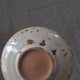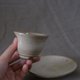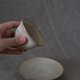 以陶土拉坏成形,不规则杯形,米黄色微亮釉面,边缘透土色,釉面偶有灰、褐色斑点。